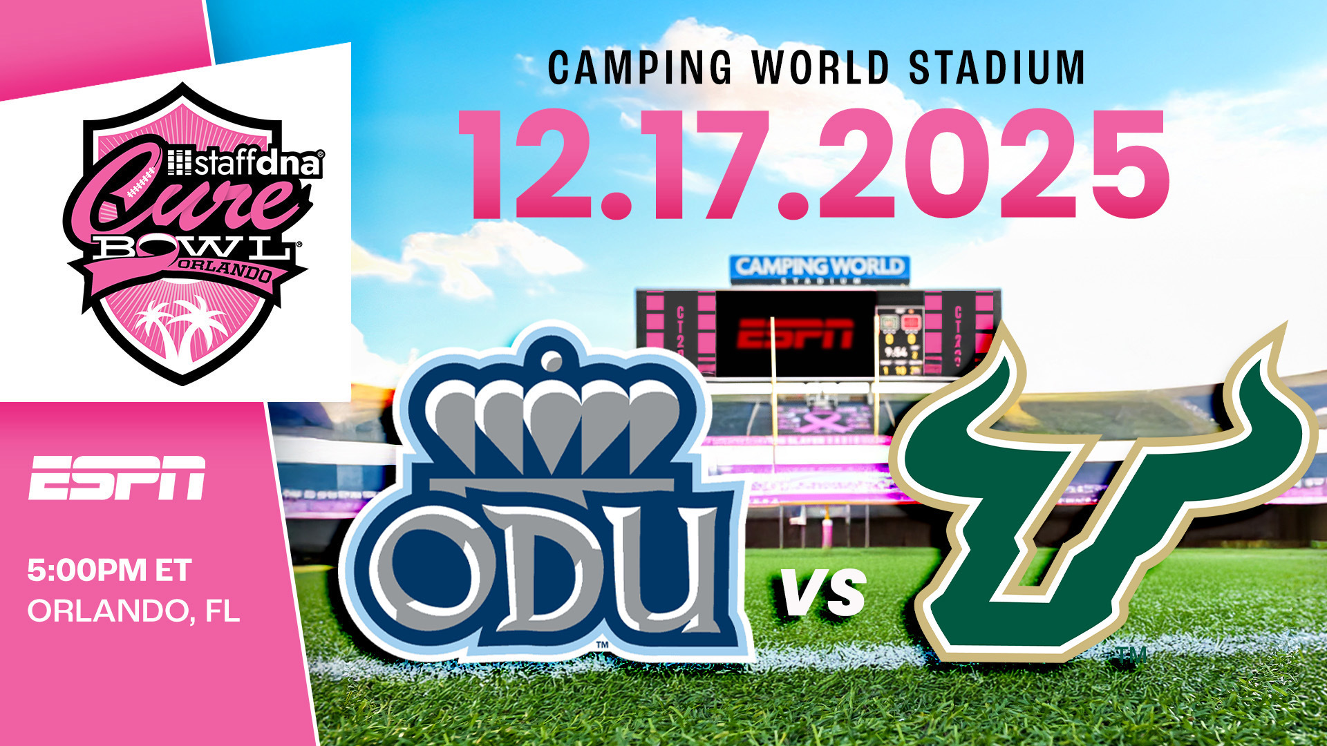 ORLANDO, Fla. (CureBowl.com) – ESPN Events and the Orlando Sports Foundation (OSF) announced on Friday that the 2025 StaffDNA Cure Bowl will be between the Old Dominion Monarchs and the South Florida Bulls at Camping World Stadium. Kickoff of the 11th-annual contest is set for Wednesday, Dec. 17, at 5 p.m. EST on ESPN.